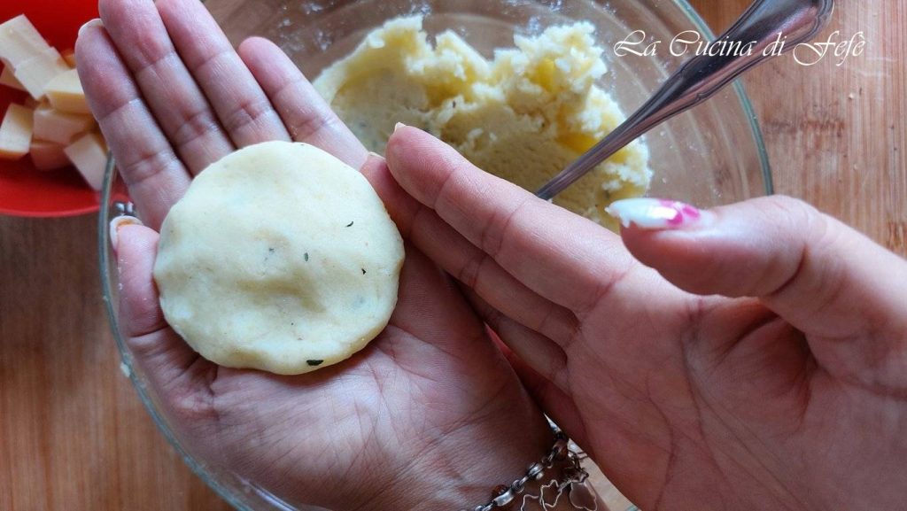 Nehmen Sie nun einen flachen Löffel Kartoffelpüree, plattdrücken zwischen den Händen und legen Sie in die Mitte 2 Käsewürfel.