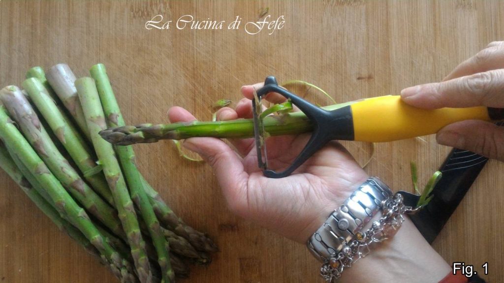 Beginnen Sie damit, die Spargel zu waschen und zu putzen, also das weiße, normalerweise härtere und zähe Ende des Stängels zu entfernen und sie so zurechtzuschneiden, dass eine gleichmäßige Garung begünstigt wird*. Schälen Sie die Spargel mit einem Sparschäler oder vorsichtig mit einem kleinen Messer, bis der Stängel frei von allen faserigen Teilen ist**.