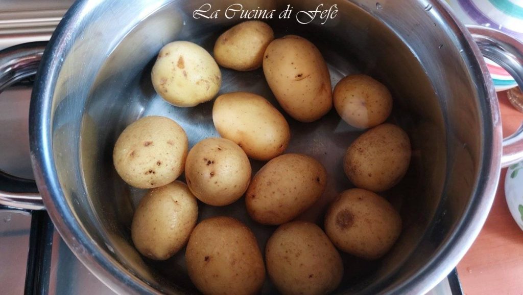 Lege die Kartoffeln anschließend in einen Kochtopf mit kaltem Wasser und bringe es zum Kochen. Koche sie ca. 15 Minuten oder bis eine Gabel leicht in die Kartoffel eindringen kann.