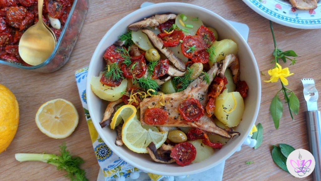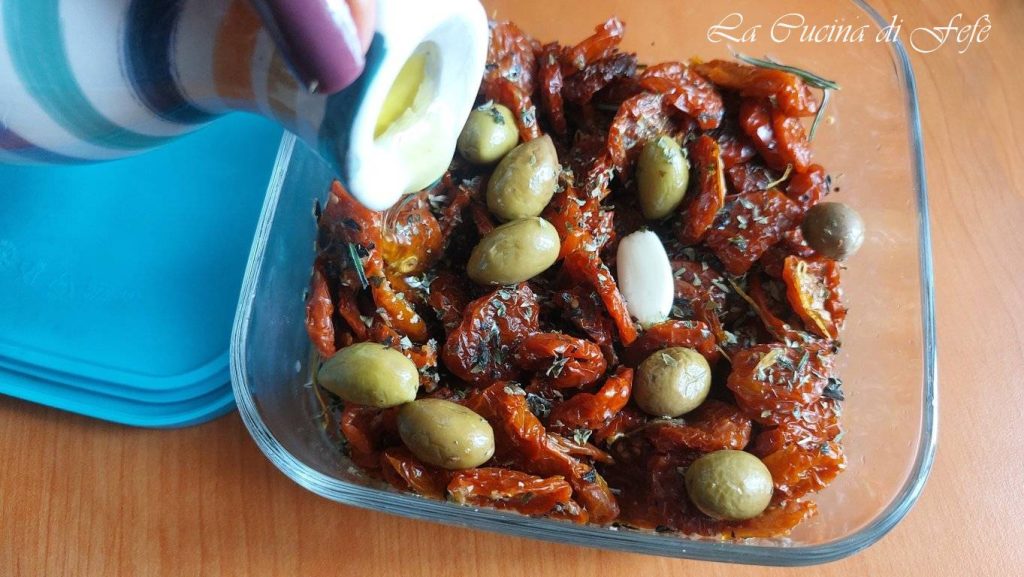 Während die Kartoffeln abkühlen, würze die getrockneten Tomaten in einer Schüssel, nachdem du sie abgetropft und mit Küchenpapier abgetupft hast, indem du Oregano und die grünen Oliven hinzufügst.