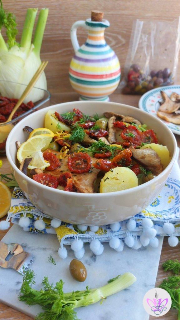 Du kennst sicherlich die Cardoncelli-Pilze, bei uns in Sizilien auch allgemein als Ferla-Pilze oder im Dialekt funci di ferula bekannt. Sie sind eine regionale Delikatesse, da sie vor allem im Mittelmeerraum wild wachsen, aber auch in anderen Teilen Italiens zu finden sind. Manche halten sie sogar für besser als die berühmten Steinpilze, da sie eine wirklich besondere Konsistenz haben. Sie eignen sich hervorragend zur Grillzubereitung, ähnlich wie ein Steak, und so habe ich diesen Kartoffelsalat bereichert, um ein außergewöhnlich leckeres Gericht zu schaffen! Wenn du es probierst, wirst du Aromen und Konsistenzen entdecken, die weit davon entfernt sind, diesen Salat als bloße Beilage zu betrachten, und er wird weitaus befriedigender als ein Hauptgericht mit Fleisch oder Fisch. Dank seiner vielseitigen Kombinationsmöglichkeiten kann er sich je nach Anlass in ein einzigartiges Gericht verwandeln, das für alle vegan geeignet ist. Wenn du diesem Basisrezept auch noch eine Proteinquelle hinzufügst, kann es das perfekte Pausenbrot sein, das du ins Büro oder für einen Ausflug mitnehmen kannst, etwa anlässlich des bevorstehenden Ostermontags, oder es eignet sich hervorragend für ein informelles Buffet unter Freunden. Probiere es in seinen vielen Varianten mit Tofu, hartgekochten Eiern, Parmesanflocken oder, warum nicht, mit in Öl eingelegten Sardellenfilets.
