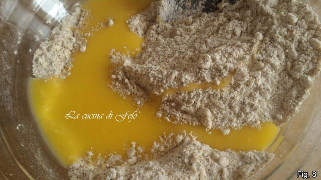 In einer anderen Schüssel schlage das Ei, die Milch und das Öl mit einem Schneebesen, füge sie dann der Pulvermischung hinzu und rühre mit einem Holzlöffel um (Abb. 8).