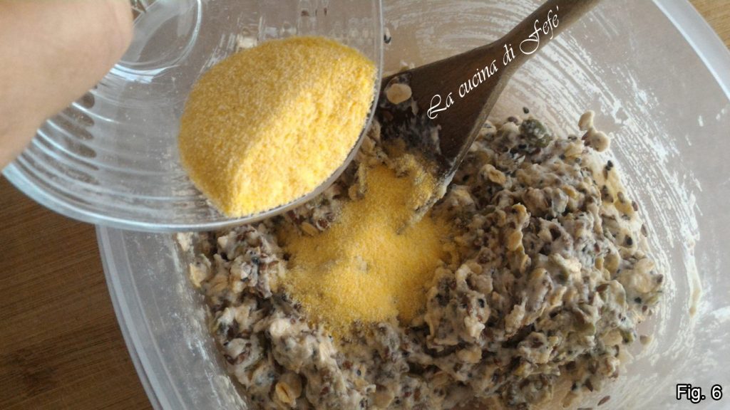 Zum Schluss das Maismehl hinzufügen. Mischen, bis alle Zutaten vermischt sind. Sollte der Teig noch zu weich sein, nach und nach mehr Maismehl hinzufügen (Abb. 6).