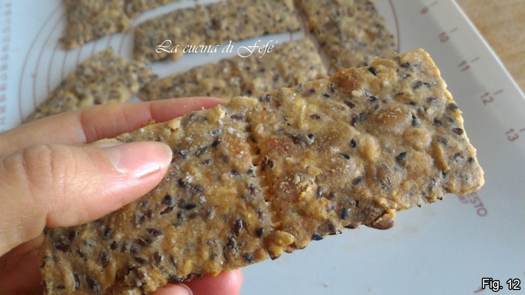 Das Rezept, das ich Ihnen heute vorschlage, wurde während eines meiner Social-Live-Events realisiert! Es lässt sich so schnell zubereiten, dass Sie es tausend weitere Male machen werden! Es handelt sich um leckere Cracker, deren Teig komplett in einer Schüssel mit einem Holzlöffel zubereitet wird, ohne sich die Hände schmutzig zu machen. Dann wird er direkt auf einem Backblech gestreckt und zwischen zwei Backpapierbögen ausgerollt. Es gibt nichts Praktischeres! Aber es gibt noch mehr! Diese Cracker bestehen aus Kerne, die von Natur aus reich an Omega-3 und Omega-6 sind, also essentielle Fette, die helfen, den schlechten Cholesterinspiegel zu senken und uns vor Arteriosklerose zu schützen. Außerdem sind sie sehr lecker und verleihen dem Teig, sobald er gebacken ist, einen wirklich einzigartig gerösteten Geschmack! Darüber hinaus sorgt das speziell ausgewählte Maismehl für eine perfekte Knusprigkeit, die der Zeit standhält! Schließlich habe ich für einen Hauch von Würze eine weitere aromatische Note mit frischem Thymian hinzugefügt und vor dem Backen Salzflocken auf die Oberfläche gestreut. Eine fantastische Kombination, so sehr, dass mein Mann heute, ein wenig neugierig, einen stahl, um ihn zu probieren, und dann verschwand, nur um wenige Augenblicke später zum Tatort zurückzukehren und dreist vor meinen Augen zuzuschlagen! Tatsächlich machen diese Cracker süchtig, aber Achtung, auch wenn es stimmt, dass Kerne eine gesunde Zutat für unseren Körper sind, kann man das von unserer Linie nicht unbedingt behaupten! Genießen Sie sie also mit Maß! Sie können sie mit ins Büro nehmen als Zwischenmahlzeit oder als gesunden Snack zum Knabbern am Nachmittag. Auch auf dem Tisch neben dem Brotkorb oder um ihn noch weiter zu bereichern, sind sie das Nonplusultra! Kurz gesagt, probieren Sie sie aus, denn ich bin überzeugt, dass Sie sich beim ersten Bissen verlieben werden!