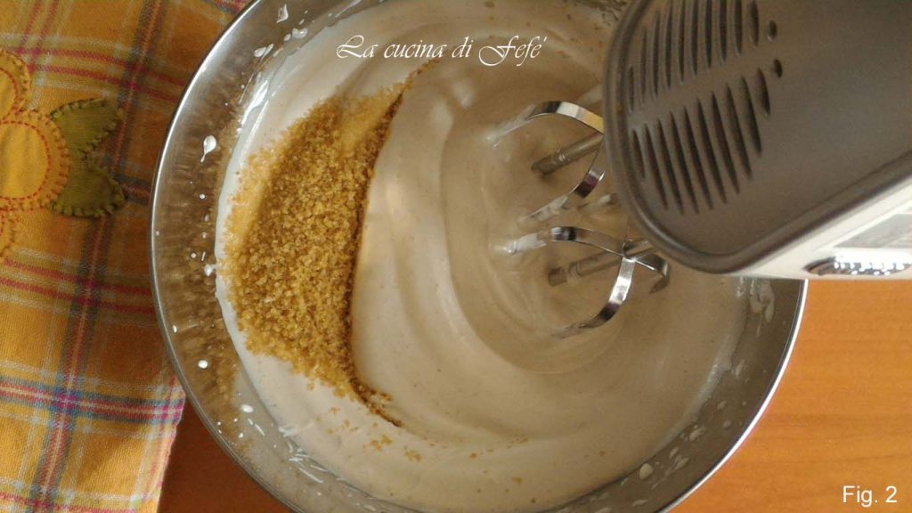 Mit Hilfe eines elektrischen Mixers die Eiweiße, die mindestens 30 Minuten bei Raumtemperatur gewesen sein müssen, steif schlagen, da sie sich besser schlagen lassen als kalte. Sobald sie anfangen zu schäumen, zuerst eine Prise Salz hinzufügen und dann die Hälfte des Zuckers einrieseln lassen und für weitere 2 Minuten weiterschlagen (Abb. 2).