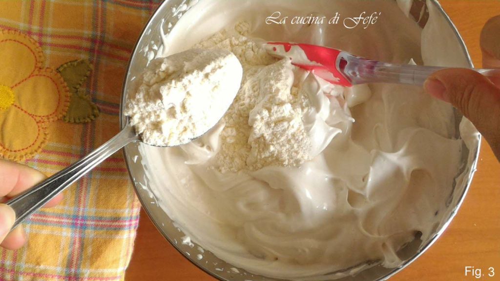 Dann den restlichen Zucker einrieseln lassen und weitere 5 Minuten schlagen, bis eine kompakte, meringueartige Mischung entsteht. Anschließend das Mehl nach und nach unterheben, wobei mit einem Spatel sehr vorsichtig von unten nach oben gerührt wird, um die Mischung nicht zu entlüften (Abb. 3).