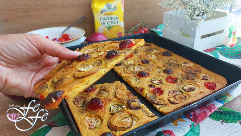 Jeder von euch kennt wahrscheinlich die Farinata, das typische italienische Gericht der ligurischen und toskanischen Tradition, eine Art salziger Kuchen aus Kichererbsenmehl, das mit Wasser angerührt und anschließend im Ofen oder in der Pfanne gebacken wird, bis es fest wird. Nun, das Rezept, das ich heute mit euch teilen möchte, ist eine Farinata, die sich für eine knusprige Variante hält! Eine Variante, die ich ausprobiert habe, indem ich Kichererbsenmehl mit Hafermehl gemischt habe, und die meiner Meinung nach wirklich lecker und noch knuspriger ist! Inspiriert von der inzwischen berüchtigten Croccantella von Diletta Secco habe ich das Gute von zwei Rezepten kombiniert und ein Rezept kreiert, das reich an Ballaststoffen, Vitaminen und Mineralien ist. Es ist sehr einfach zuzubereiten und wird ein perfekter Abendessenretter und Kühlschrankausputzer sein, indem Sie alle Gemüse, die übrig geblieben sind oder die Ihre Fantasie und Ihr Einfallsreichtum vorschlagen, hinzufügen. Ich habe eine Version mit Zucchini, Tropea Zwiebel und Kirschtomaten erstellt. Eine unglaubliche Köstlichkeit! Außerdem ist es ein veganes und laktosefreies Rezept, was nicht schadet, oder? Das Geheimnis für ein hervorragendes Ergebnis ist die Form, die antihaftbeschichtet, flach und im richtigen Durchmesser sein sollte! Außerdem ist der Einsatz des Umluftofens in den letzten Minuten des Backens wichtig! Der Rest ist ein Kinderspiel! Sie können es noch heiß und knusprig in Quadrate geschnitten als Aperitif servieren, als Snack zu einem informellen Abendessen oder als rustikales Hauptgericht in einem gesunden und leichten Brunch genießen. Kurz gesagt, jede Gelegenheit ist die richtige, um Ihre Gäste zu beeindrucken und ein köstliches und wirklich unwiderstehliches Gericht zu genießen!