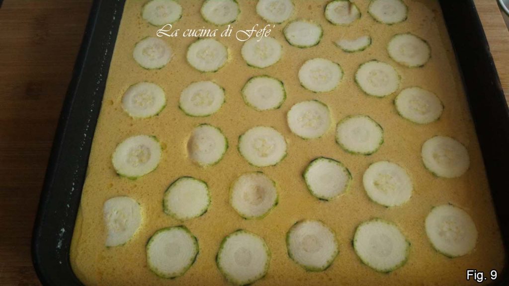 Übertragt die Mischung in eine breite und flache antihaftbeschichtete Form* und gut geölt**. Verteilt auf der gesamten Oberfläche die Zucchinischeiben.