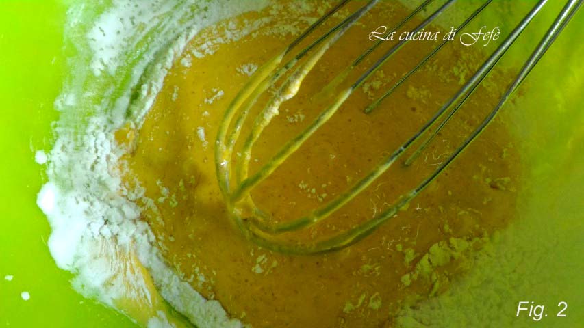 In einer Schüssel die Eigelbe zusammen mit dem Zucker schnell schlagen, ohne Zeit zu verlieren, damit der Zucker nicht die wässrigen Teile der Eigelbe aufnimmt und die Proteine kristallisiert. Wenn die Mischung homogen ist, die Maisstärke direkt in die Schüssel sieben und mit dem Schneebesen einrühren.