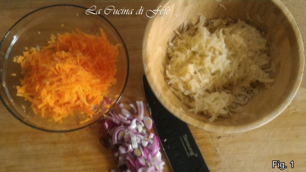 Waschen Sie die Kartoffeln und Karotten unter fließendem Wasser, schälen Sie sie und reiben Sie sie mit einer groben Reibe. Schälen Sie auch die halbe Zwiebel und hacken Sie sie fein (Abb. 1).