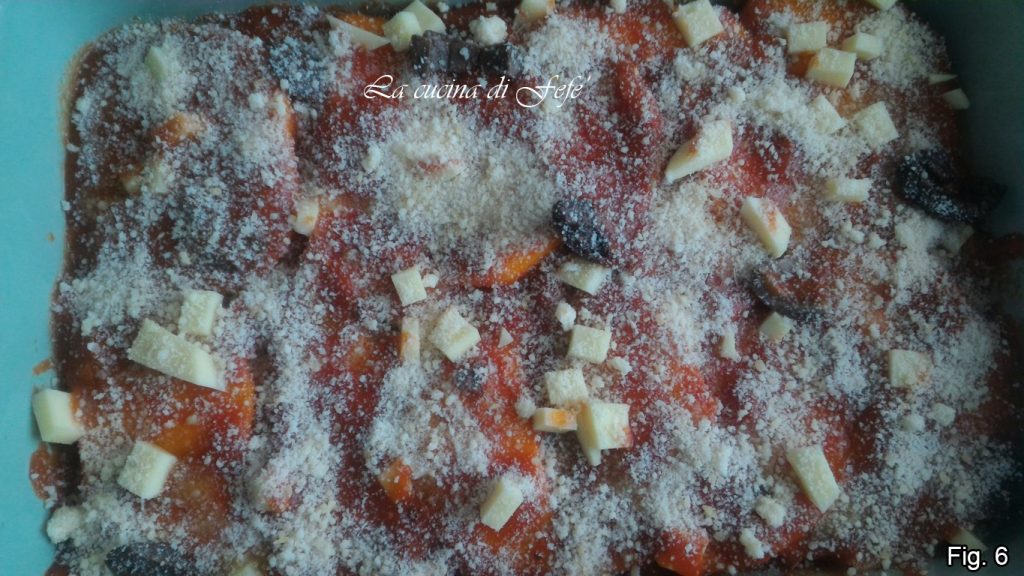 Beenden Sie mit der restlichen Tomatensoße, einer großzügigen Prise Parmesankäse, Öl, würzen Sie mit Salz, der Provola in Würfeln und den Oliven. Wenn Sie noch Zutaten übrig haben, je nach Größe der Auflaufform können Sie auch eine vierte Schicht machen (Abb. 6).