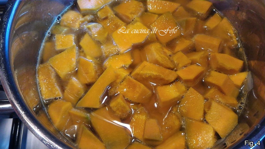 Fügen Sie auch den in Würfel geschnittenen Kürbis hinzu und bedecken Sie ihn vollständig mit der Gemüsebrühe. Lassen Sie es ab dem Siedepunkt 25 Minuten köcheln. Das Gemüse sollte schön weich sein (Bild 4).