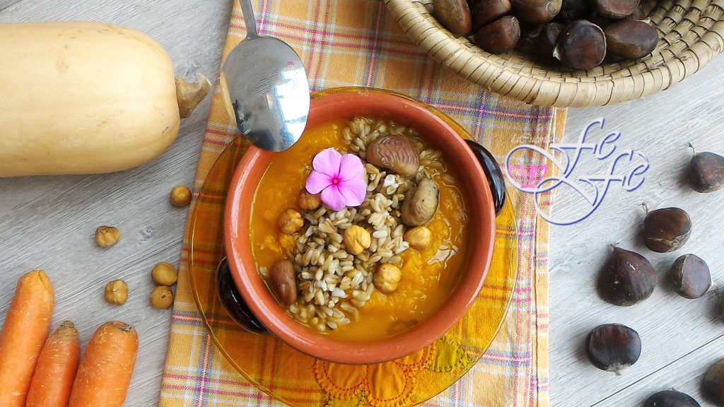Seid ihr mit mir einer Meinung, dass November wie Januar zwei Monate sein sollten, die den gesunden Gerichten vor und nach den großen Weihnachtsessen gewidmet sind? Ich habe nach dem Sommer wieder angefangen, gesund zu kochen, was mir überhaupt nicht missfallen hat, da mein Körper bereits erste Anzeichen von Unwohlsein zeigte. Aber ich gestehe euch, und ich denke, ihr habt es schon verstanden, dass ich diese gesunden, dampfenden und gemütlichen Gerichte sowieso mag!!! Und dann werdet ihr eine Reihe von fit und detox Rezepten über euch ergehen lassen müssen, die nur teilweise so sind, wenn man alle verwendeten Zutaten berücksichtigt. Außerdem hoffe ich, dass sie für diejenigen, die wie ich Cremesuppen lieben, eine zusätzliche Inspiration sind, um von den üblichen traurigen Rezepten mit gekochtem Gemüse abzuweichen. Das heutige Rezept war ein unglaublicher Erfolg, nicht nur, weil es ein vollständiges Gericht aus ernährungsphysiologischer Sicht ist, sondern auch, weil meiner Meinung nach der süße Geschmack von Kürbis und Karotten gut mit der Vollkorn-Hafer-Konsistenz und dem ausgeprägt rustikalen Geschmack der gerösteten Haselnüsse harmoniert. Und da wir im Herbst sind, habe ich neben den Haselnüssen auch gehackte, gedämpfte Kastanien hinzugefügt. Wie viele von euch wissen, werden dieKastanien schon immer als das „Brot der Armen“ betrachtet, was viel über die Makronährstoffe aussagt, die diese Früchte unserem Körper bieten. Natürlich ist Trockenfrüchte sehr kalorienreich, aber sie kompensieren alles andere vollständig! Ein ausgewogenes, gesundes und schmackhaftes Gericht, das Sie nicht enttäuschen wird!