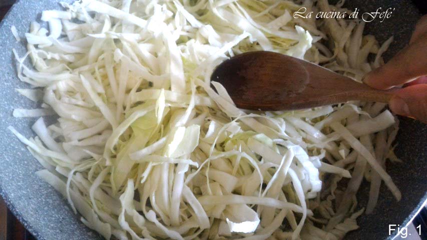 Waschen Sie die Blätter des Weißkohls unter fließendem Wasser, schleudern Sie sie in einer Salatschleuder trocken, und schneiden Sie sie dann in feine Streifen. Dünsten Sie sie in einer beschichteten Pfanne mit einem Schuss Öl und einer Prise Salz etwa 15 Minuten bei schwacher Hitze, fügen Sie bei Bedarf ein paar Esslöffel Wasser hinzu. (Abb. 1).