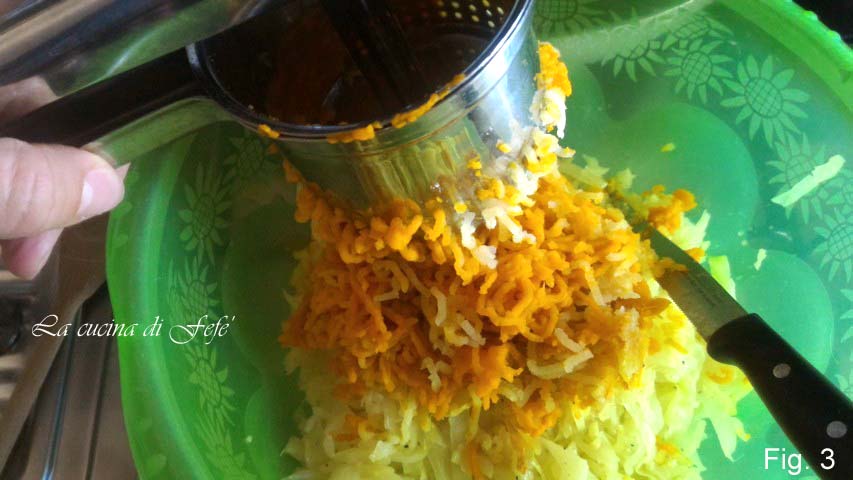Geben Sie den gedünsteten Kohl in eine große Schüssel. In der Zwischenzeit kochen Sie die Kartoffel und den Kürbis in Salzwasser für 20 Minuten. Abgießen und noch heiß mit einem Kartoffelstampfer zerdrücken und zum gekochten Kohl hinzufügen (Abb. 3).