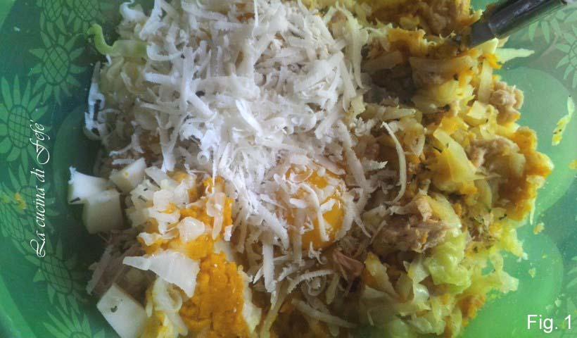 Schneiden Sie den milden Provola in Würfel und fügen Sie ihn der Mischung hinzu. Fügen Sie auch den gut abgetropften Thunfisch, das Ei, die Hälfte des geriebenen Parmesans, den zerkleinerten Rosmarin und die Muskatnuss hinzu. Schmecken Sie mit Salz ab und pfeffern Sie. Mischen Sie die Mischung gut durch (Abb. 4).