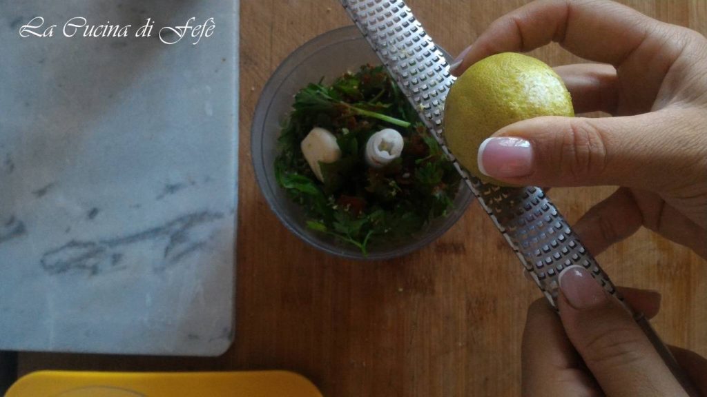 Ist es Ihnen schon einmal passiert, dass Sie tagelang nicht einkaufen gehen konnten und fast nichts mehr in der Speisekammer zum Kochen hatten? Mir passiert das oft, besonders während der Grippezeit, wenn das Fieber Ihre Aktivitäten für längere Zeit blockiert und Sie gezwungen sind, mit den wenigen Lebensmittelvorräten, die Sie zur Verfügung haben, weiterzumachen! Diese Linguine sind genau aus diesem Bedürfnis heraus entstanden, und es ist wirklich wahr, dass „Not macht erfinderisch„! Wenige und einfache Zutaten, die wir alle zu Hause haben, für ein einfaches und köstliches vegetarisches Hauptgericht, zubereitet mit einem intelligent recycelten Dressing aus Petersilie und Limette, das zum Fingerlecken ist! Ich habe dann, als gute Sizilianerin, das Gericht mit etwas Paniermehl angereichert, das in der Pfanne mit etwas Öl goldbraun geröstet wurde, eine Delikatesse! Wenn auch Sie ein schönes Bund Petersilie haben, das im Kühlschrank zu welken droht und Sie nicht wissen, wie Sie es loswerden sollen, probieren Sie diese praktische und gleichzeitig schmackhafte Idee mit nur zwei Schritten am Herd und in nur wenigen Minuten! Es wird die perfekte Lösung sein, wenn Sie unerwartete Gäste haben oder schnell ein Gericht zubereiten möchten, ohne viel Zeit und noch weniger Geld zu investieren! Kurz gesagt, ein verschwenderisches Gericht im echten Economy-Stil, aber mit einer großartigen Endleistung!