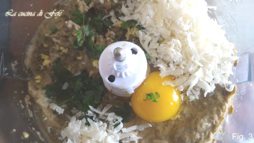 Fügen Sie ein Ei, den frisch geriebenen Ingwer, die grob gehackte Petersilie, 5 Esslöffel Paniermehl und den geriebenen Parmesan hinzu (Abb. 3).