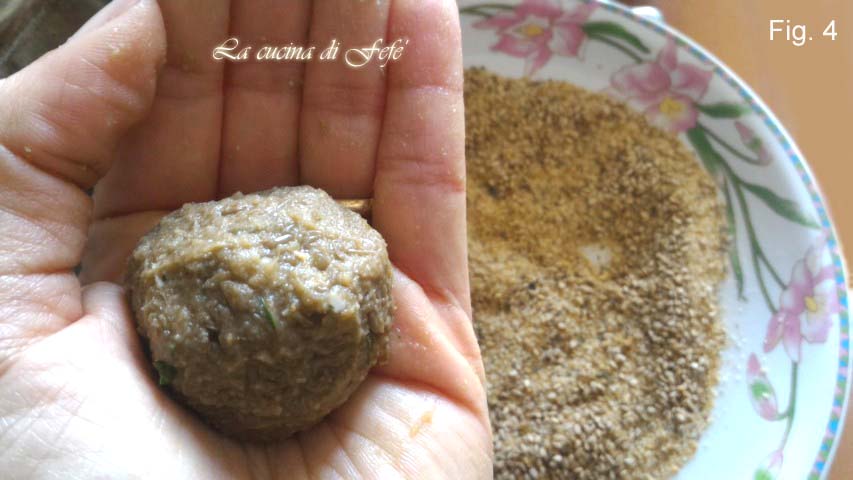 Drücken Sie sie leicht flach und wenden Sie sie zuerst in dem mit einer Prise Muskatnuss geschlagenen Ei, dann im Paniermehl, das mit Sesamsamen vermischt ist. Legen Sie die Bällchen auf ein mit Backpapier ausgelegtes Backblech und beträufeln Sie die Oberfläche mit Olivenöl (Abb. 5).