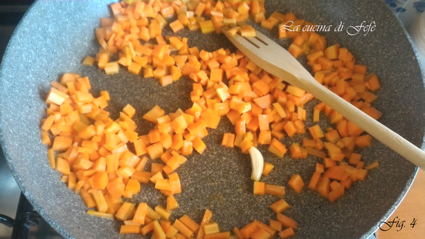 • In einem Wok die Karottenbrunoise mit einer Knoblauchzehe, einem Schuss Olivenöl extra vergine und zwei Esslöffeln Linsenbrühe anbraten (Abb. 4).