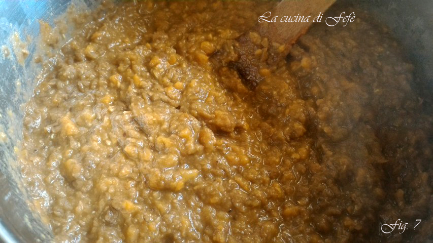 • Dann die Tomatensauce nach und nach hinzufügen, abwechselnd mit ein paar weiteren Esslöffeln Linsenbrühe, nach Bedarf und etwa 15 Minuten bei mittlerer Hitze kochen lassen (Abb. 5).