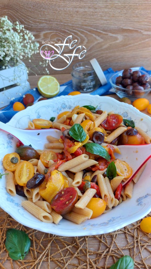 Heute möchte ich mit euch ein vielfach erprobtes Familienrezept teilen, ein Muss in unserem Sommer seit ewigen Zeiten, wirklich einfach und schnell! Ich erinnere mich, wie meine Mutter es uns jedes Jahr vorschlug, nachdem wir ins Strandhaus gezogen waren, das war das Symbol unserer Ferien, da sie es oft machte und wir verrückt danach waren! Sie nannte sie Penne di mezzanotte, ich kann nicht sagen, warum und ob der Name mit einem typischen regionalen Gericht zu tun hat, ich habe es nie verstanden, aber wenn ihr wie wir Paprika-Liebhaber seid, müsst ihr es unbedingt probieren! Dank der Marinade ihrer Zutaten wird der Duft, den dieses Gericht verströmen wird, etwas Einzigartiges sein! Im Vergleich zu den klassischen glatten Penne, die meine Mutter zubereitete, habe ich die gerillten in einer Vollkornversion gewählt, rustikaler und ballaststoffreicher. Und hier ist es eine Geschmacksfrage, beide werden trotzdem hervorragend sein! Außerdem habe ich der Marinade auch eine Handvoll Oliven hinzugefügt, die ursprünglich nicht vorgesehen waren, die meiner Meinung nach jedoch eine zusätzliche Note von Würze verleihen! Kurz gesagt, in wenigen und einfachen Schritten erhaltet ihr ein frisches und sehr duftendes Hauptgericht im veganen Stil, da es keine tierischen Zutaten enthält. Es wird großartig sein, es auf den Tisch, ans Meer oder ins Büro zu bringen. Denn sobald die Paprika im Ofen gebacken und gut geschält sind, wird die Soße, die eure Nudeln würzt, einfach komplett roh zubereitet. Also ideal für diese heißen Sommertage, die für Leute wie mich das Zauberwort sind! Das Originalrezept sieht auch die Verwendung von gelben Paprika neben den roten vor, um dem Gericht eine farbliche Note zu verleihen, aber wenn ihr keine zu Hause habt, könnt ihr sie problemlos durch weitere rote ersetzen. Das wird den endgültigen Geschmack nicht verändern, wichtig ist, dass Qualitätsprodukte verwendet werden! Einmal ausprobiert, wie es bei uns in der Familie geschehen ist, werdet ihr es nicht mehr aufgeben!