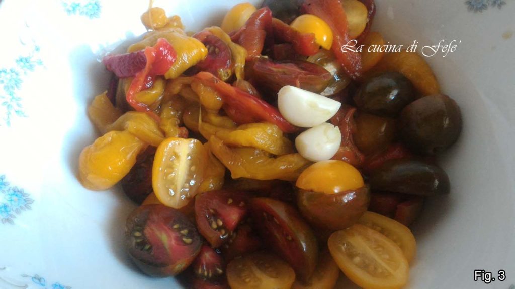 • Wascht die Kirschtomaten, halbiert sie, gebt sie zu den Paprika, fügt dann auch die Knoblauchzehen hinzu und mischt alles.