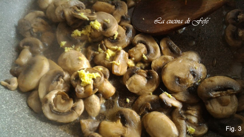 Etwa 20 Minuten kochen lassen. In der Zwischenzeit die Pilze mit einem sauberen, feuchten Tuch abwischen, in Scheiben schneiden und in einer Pfanne mit der Knoblauchzehe andünsten (Abb. 2).