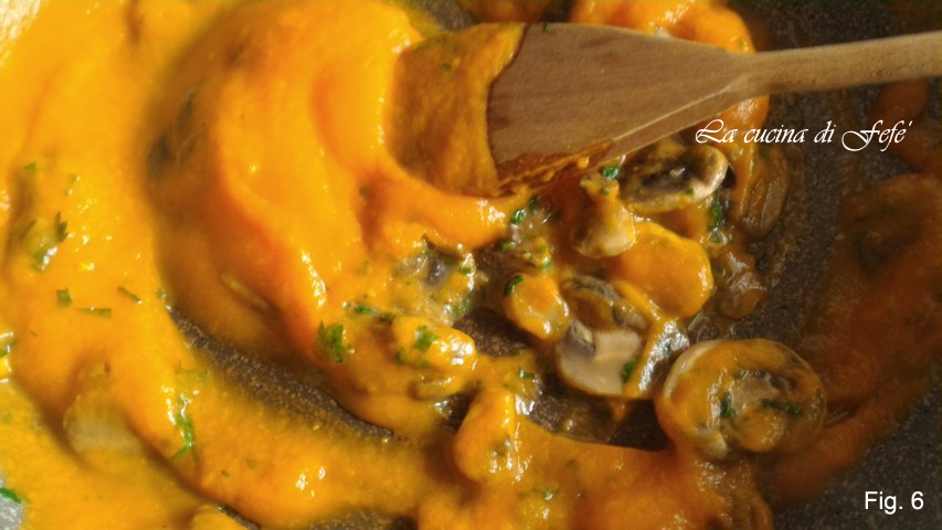 In einem großen Topf reichlich Salzwasser zum Kochen bringen, die Mezzani 2 Minuten weniger als auf der Packung angegeben kochen. Mit einem Schaumlöffel abgießen und zur Kürbiscreme und den Pilzen geben (Abb. 8).