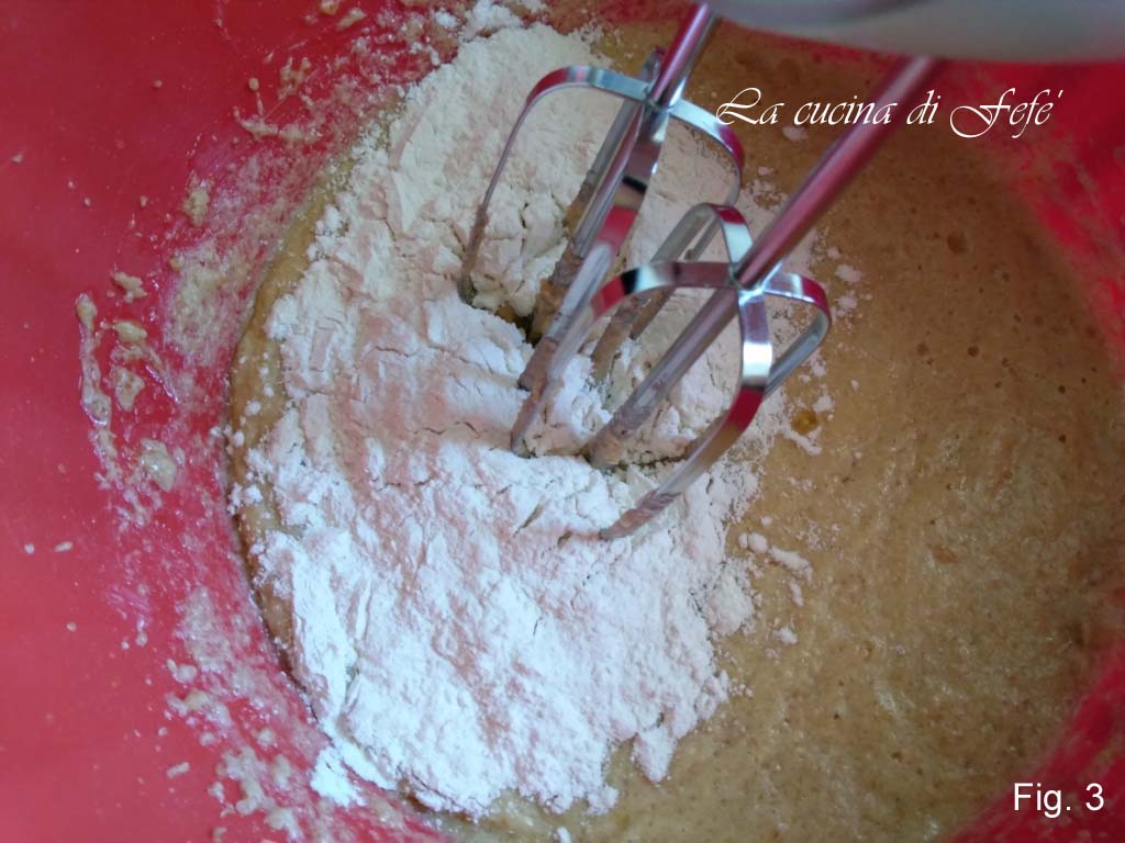 Sieben Sie das Mehl mit dem Backpulver und fügen Sie es dem Teig nach und nach hinzu, während Sie weiter mit den Schneebesen arbeiten (Abb. 3).