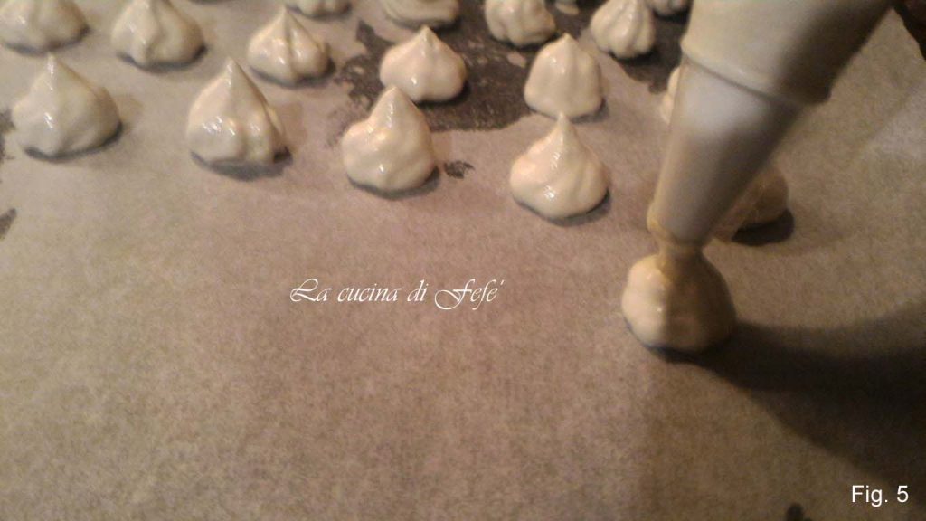 • Ein Backblech mit Backpapier auslegen, das gut an den Ecken mit etwas Öl festgehalten wird, damit es gut haftet. Die Baisermasse in einen Spritzbeutel mit Sterntülle füllen und Tupfen mit einem Durchmesser von 2 cm herstellen.