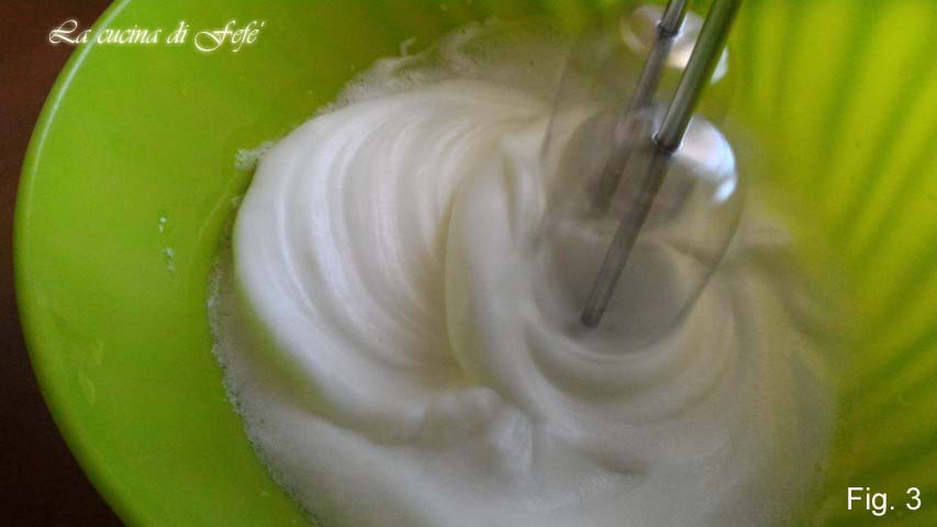 Dann vom Herd nehmen und abkühlen lassen. In der Zwischenzeit die Eigelbe von den Eiweißen trennen. Letztere mit einer Prise Salz steif schlagen (Abb. 3).