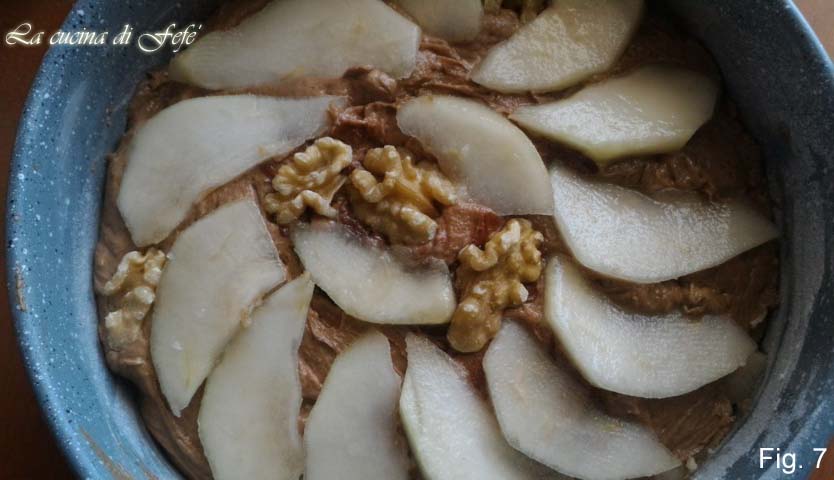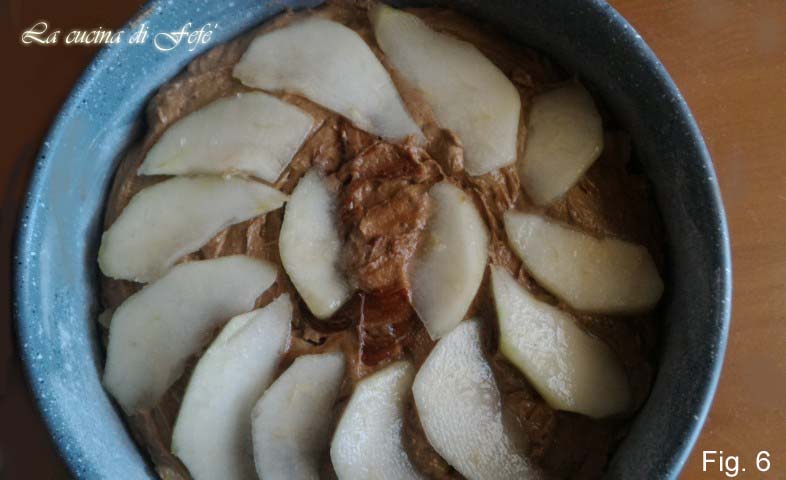 Schließlich die Eischneemasse, die Hälfte nach der anderen, unterheben, mit einem Spatel vermischen und die Mischung in eine zuvor eingefettete und bemehlte Springform gießen. Glätten Sie es und verteilen Sie die Birnenscheiben darauf (Abb. 6).