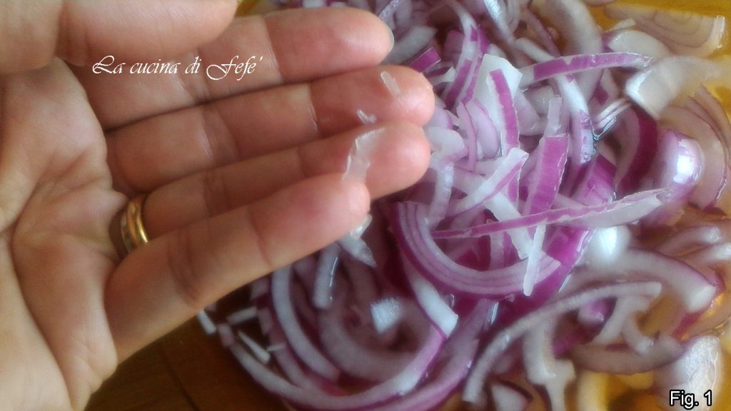 Beginnen Sie damit, die rote Zwiebel zu schälen, sie in Ringe zu schneiden und 10 Minuten in Wasser einzuweichen, reiben Sie mit den Händen, um die schwer verdauliche innere Haut zu entfernen.