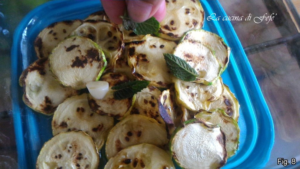 Schichten Sie sie in einer Schüssel und würzen jede Schicht mit einem Schuss Öl, gehacktem Knoblauch und Minzblättern. Lassen Sie sie 30 Minuten ruhen.