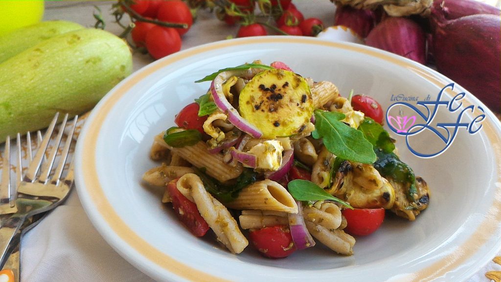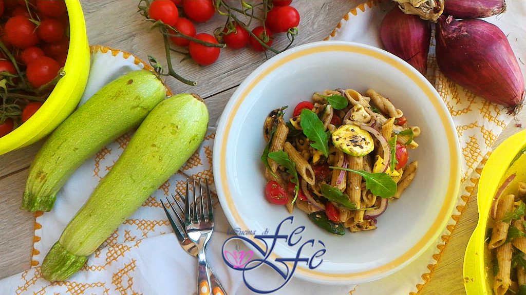 Vor ein paar Wochen fand ich in meiner Speisekammer zwei Packungen Nudeln, Penne und Fusilli, die ich einzeln nie hätte verwenden können, da beide Mengen zu gering für jede Zubereitung waren! Also entschied ich mich aus Notwendigkeit, sie zusammen zu kochen, ohne zu ahnen, wie gut dieses Spiel aus verschiedenen Formaten, obwohl beide aus Vollkornmehl, letztendlich sein würde. Natürlich haben auch die Zutaten, die ich hinzufügte, eines der besten Sommergerichte hervorgebracht, die ich je zubereitet habe! Und da ich damals den Geschmack unterschätzt hatte, kam ich nicht einmal auf die Idee, die Schritte und das vollständige Gericht zu fotografieren. Deshalb habe ich beschlossen, es angesichts der außergewöhnlichen Hitze dieser Tage noch einmal auf den Tisch zu bringen und diesmal auch hier auf dem Blog mit euch zu teilen! Ein vegetarisches Hauptgericht mit gegrillten Zucchini, Kirschtomaten, Rucola, Tropea-Zwiebel und griechischem Feta. Unglaublich lecker, perfekt zum Mitnehmen an den Strand oder für ein Picknick im Freien! Probiert es auch aus und lasst es mich wissen.