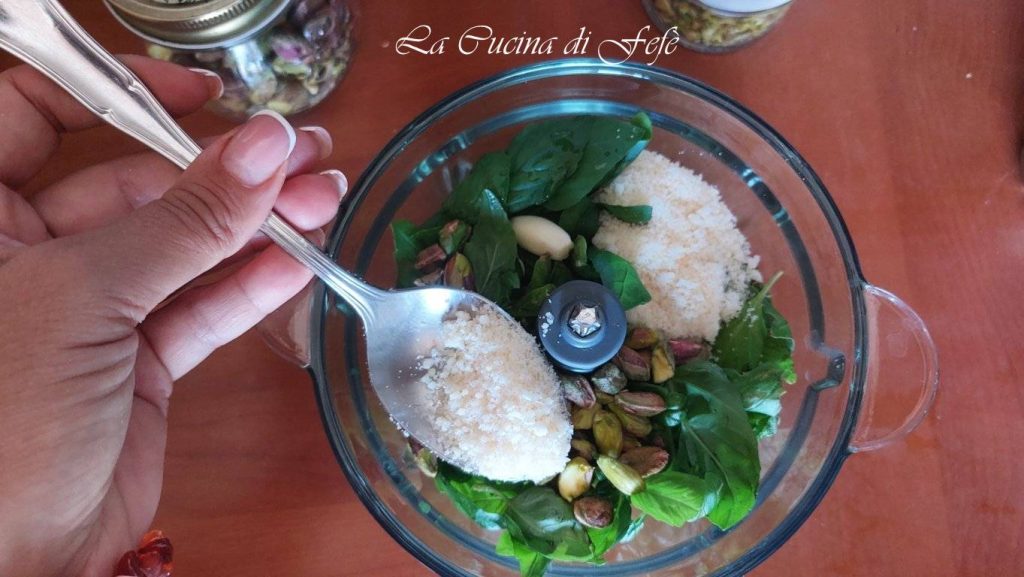 Geben Sie das Basilikum zusammen mit einer Knoblauchzehe, den Pistazien und dem geriebenen Parmesankäse in einen Mixer.
