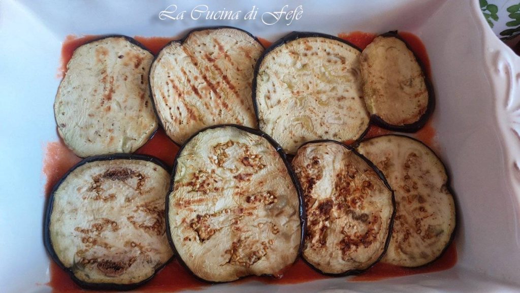 Bedecken Sie den Boden einer antihaftbeschichteten Auflaufform mit ein paar Löffeln Tomatensauce und beginnen Sie, die gegrillten Auberginenscheiben als erste Schicht zu legen. Ordnen Sie sie nebeneinander, leicht überlappend, an.