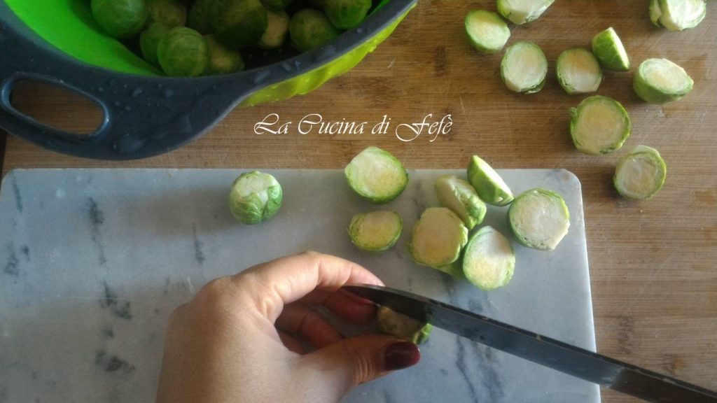 • Beginne damit, den Rosenkohl unter fließendem Wasser gut zu waschen, dann entferne den Strunk und eventuell vergilbte Blätter mit Hilfe eines kleinen Messers.
