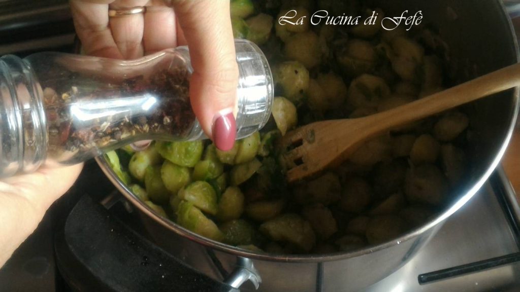 • Koche etwa 15′ weiter, bei niedriger Hitze, bis der Rosenkohl gut gekocht und weich ist und die Flüssigkeit fast vollständig verdampft ist. Wenn während dieser Zeit nötig, kannst du nach Bedarf mehr Brühe hinzufügen. Mit Salz und Pfeffer abschmecken.