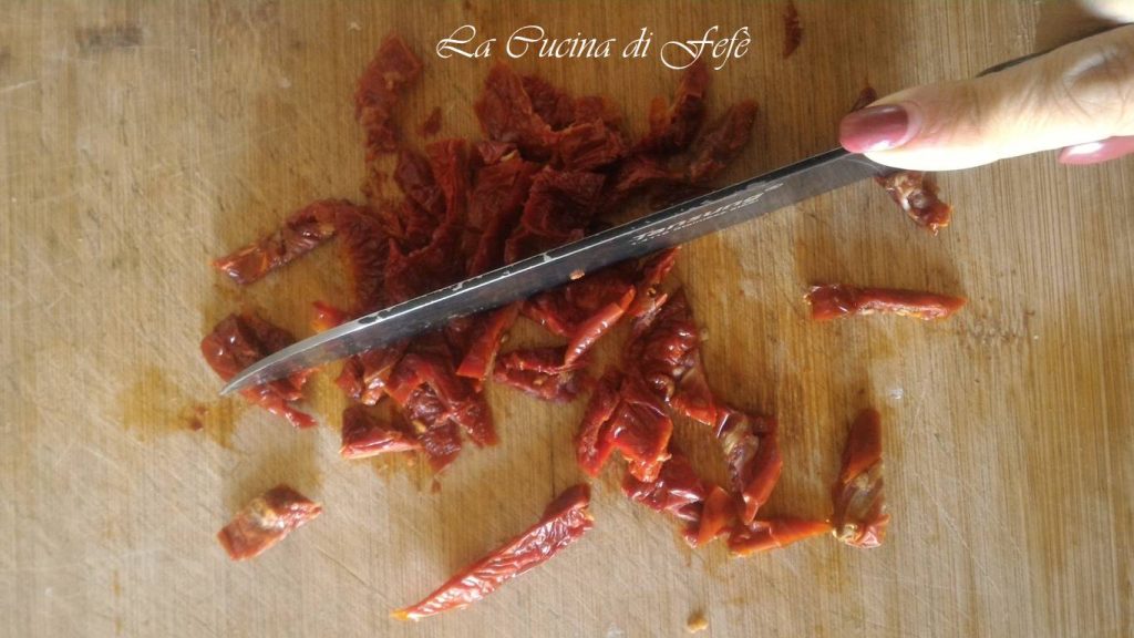 • In einem separaten Topf, blanchiere in ungesalzenem kochendem Wasser mit einem Esslöffel Weißweinessig auch die getrockneten Tomaten für 2′-3′.