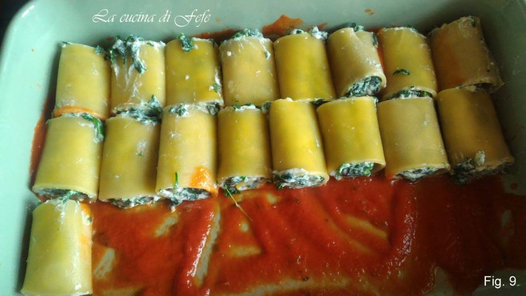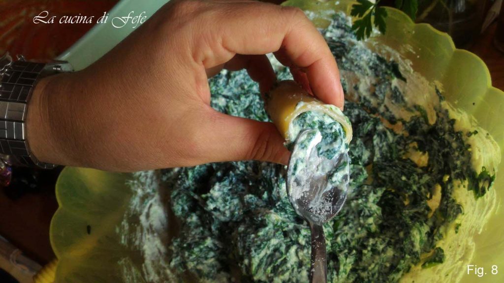 • Fülle die Paccheri einzeln mit der Ricotta-Spinat-Mischung.