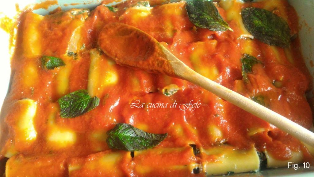 • Decke sie mit weiterer Tomatensauce ab, beträufle alles mit etwas Öl und gib die Minzblätter darüber.