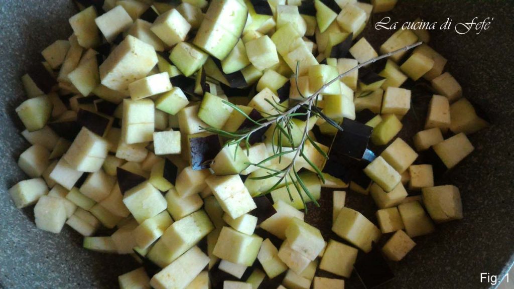 Die Aubergine waschen, den Stiel entfernen und in Würfel schneiden. Diese in einer Pfanne mit 2 Esslöffeln Öl und 2 Esslöffeln Wasser sowie einem ganzen Rosmarinzweig andünsten.