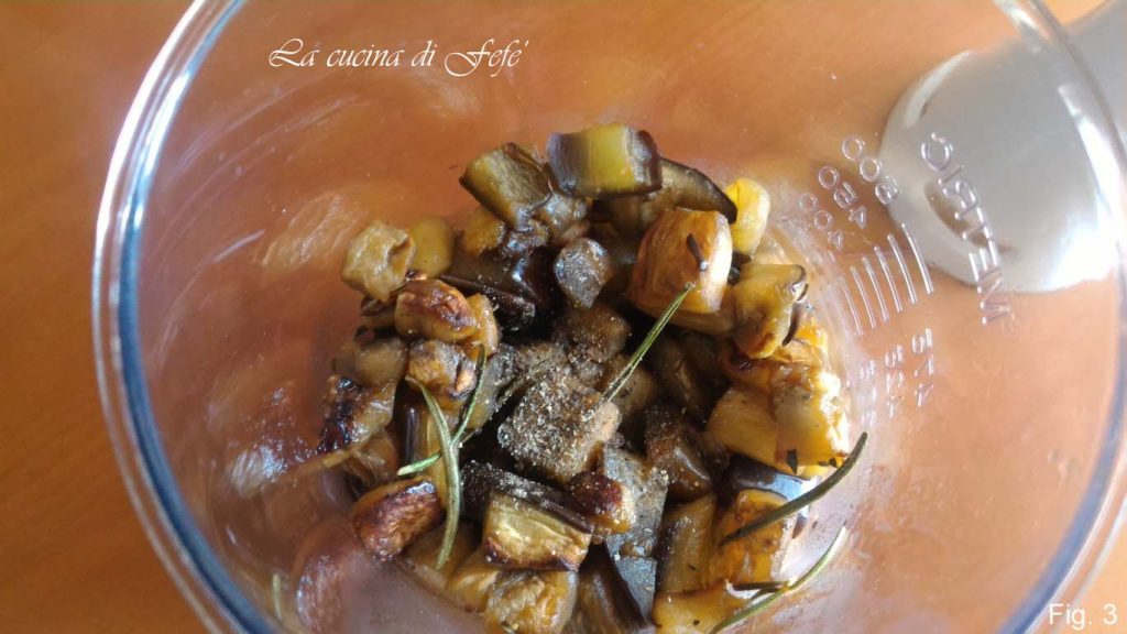 In der Zwischenzeit die Pasta in reichlich gesalzenem Wasser kochen. Dann die gekochten Auberginenwürfel in den Behälter eines Mixers geben und mit Salz abschmecken sowie mit weiterem abgezupften Rosmarin aromatisieren.