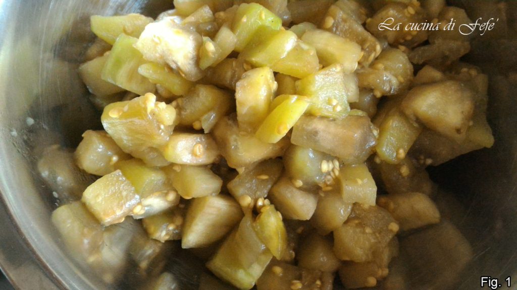 An diesem Punkt die geschmorten Auberginen hinzufügen, salzen, pfeffern, den Deckel schließen und bei schwacher Hitze für ca. 20′ kochen lassen.