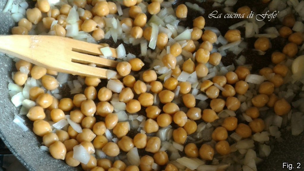 Auberginen abgießen und beiseite stellen. Im selben Wok lassen Sie eine Knoblauchzehe goldbraun werden und die fein gehackte Zwiebel weich werden. Nach 2 Minuten, fügen Sie die in Brunoise geschnittenen Karotten und die abgespülten und gut abgetropften Kichererbsen hinzu.