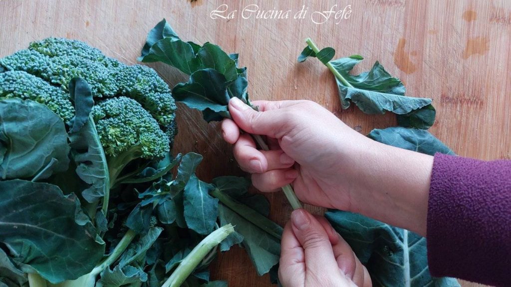 • Bringe einen Topf mit Salzwasser zum Kochen. Gib zuerst die Stielwürfel hinein und lass sie etwa 5 Minuten kochen. Gib dann die Blätter dazu: sie werden sofort zusammenfallen und ihr Aroma freisetzen. Lass alles weitere 2′ kochen.