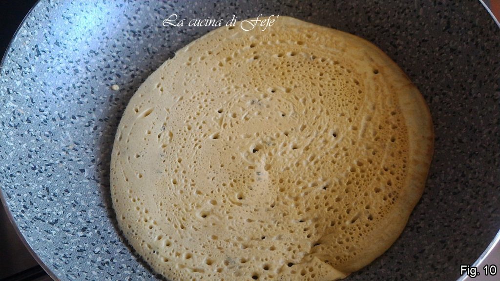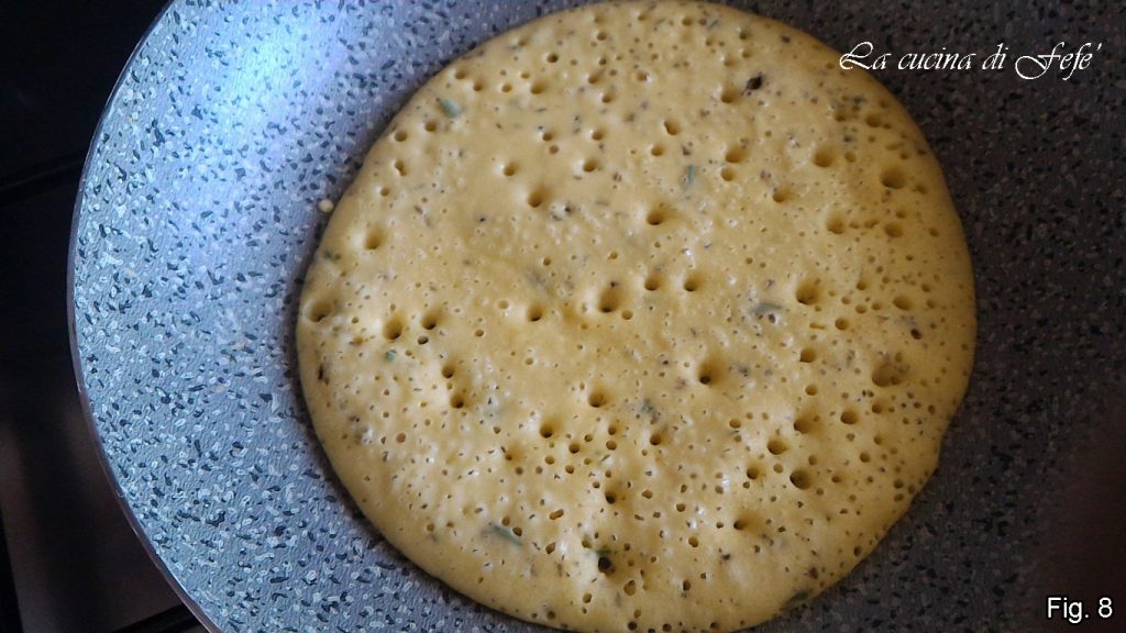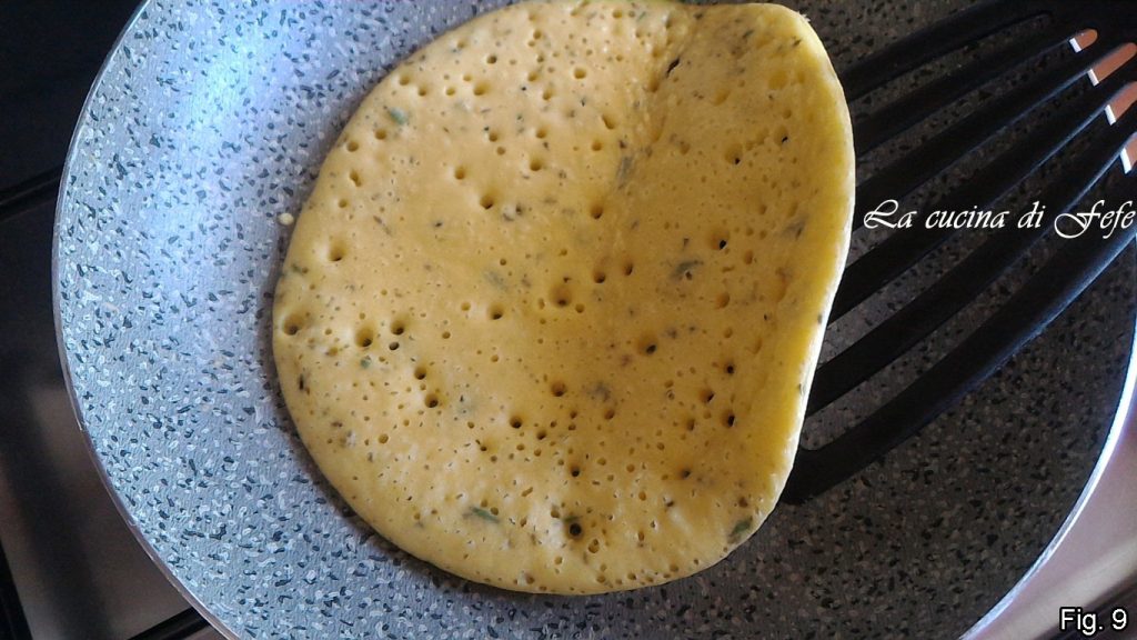 Auf einer gut erhitzten Pfanne bei mittlerer Hitze verteilen und warten, bis sich Blasen an der Oberfläche bilden (abb. 8).