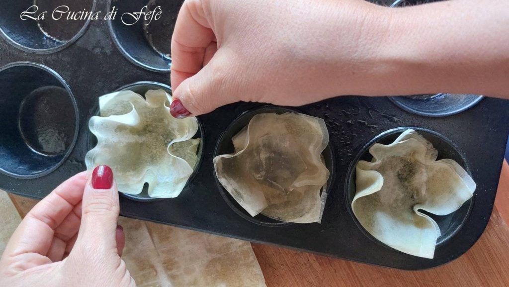Fetten Sie eine Muffinform mit Öl ein und legen Sie jede Vertiefung mit drei Phylloteigquadraten aus, wobei Sie darauf achten sollten, sie versetzt übereinander zu legen, also die Spitzen nicht aufeinander abzustimmen, und ihnen die Form eines Körbchens zu geben.